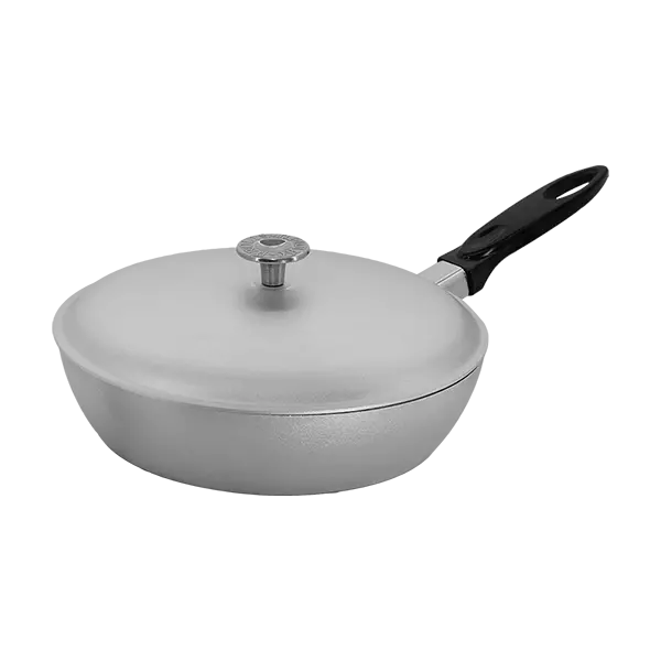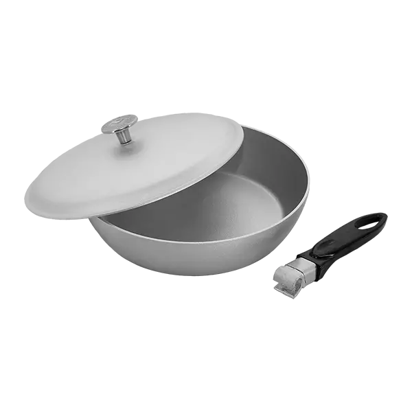 Описание: Сковорода алюминиевая со съемной пластмассовой ручкой и крышкой.