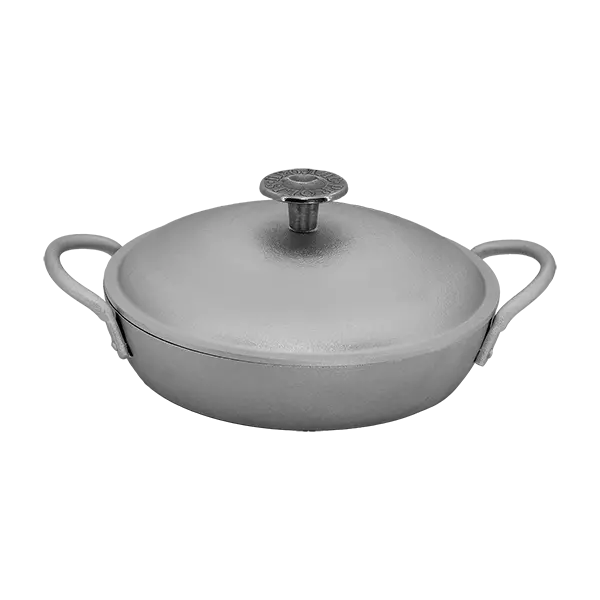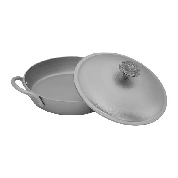 Описание: Сковорода жаровня алюминиевая с двумя клепаными ручками и крышкой.