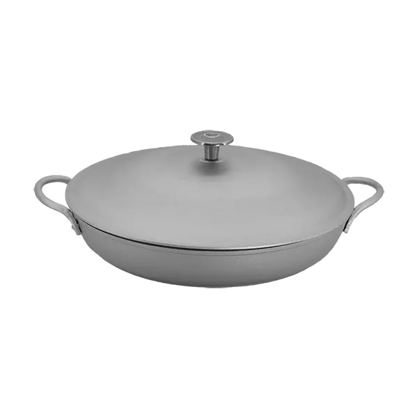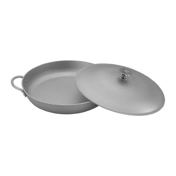 Описание: Сковорода жаровня алюминиевая с двумя клепаными ручками и крышкой.