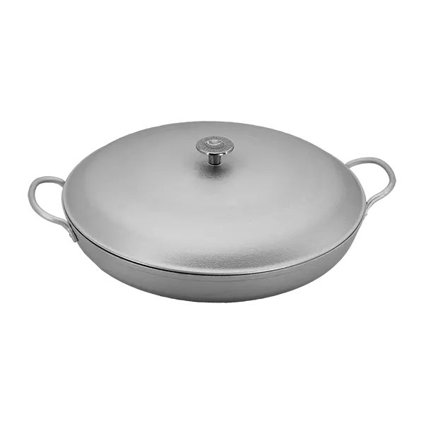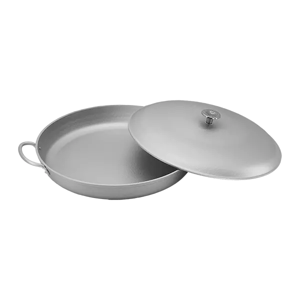 Описание: Сковорода жаровня алюминиевая с двумя клепаными ручками и крышкой.